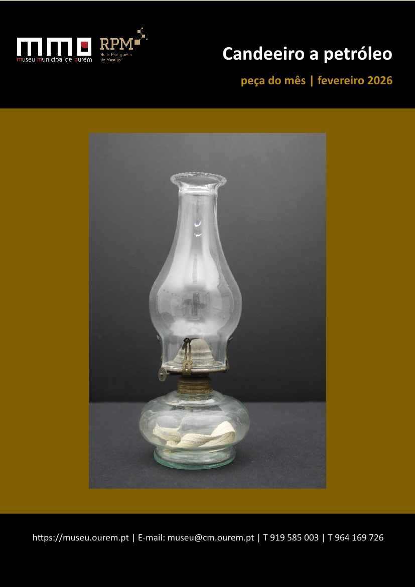 PEÇA DO MÊS | fevereiro 2026 Candeeiro a petróleoDI.AA.073Em fevereiro destacamos como PEÇA DO MÊS, um candeeiro a petróleo que integra o acervo do Museu Municipal de Ourém.Proveniente da Escola primária do Bairro, da freguesia de Nossa Senhora das Misericórdias, foi utilizada no século XIX/XX.É uma peça em vidro transparente, exceto a ligação (em lata) entre o depósito e a chaminé, onde fica o parafuso que permite regular a intensidade da chama. O depósito de formato cilíndrico, possui um pavio feito de tecido que fica ensopado de combustível e a chaminé é em forma de meia ampulheta. O abastecimento do depósito é feito removendo a chaminé que se enrosca ao depósito.A peça escolhida pertence à coleção de etnografia, que resulta de campanhas sistemáticas de coleta de objetos (com início em 1995), destinadas a registar, documentar e patrimonializar as expressões da vida tradicional do concelho de Ourém.Conheça o espólio do Museu Municipal através das suas reservas e das suas exposições!!